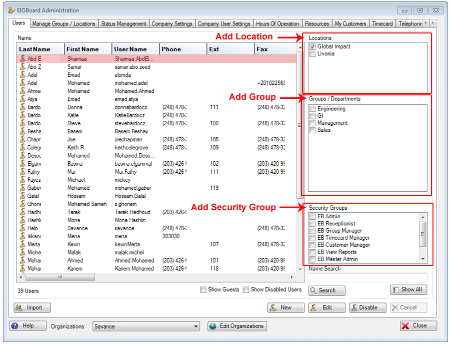 Our administration area allows you to customize EIOBoard to fit your organizational needs. You have several options: Managing All Your Users Locations and Groups, Changing Status Colors, Enabling and Disabling Settings, Setting Up Timesheets, Configuring Telephone Integration, and much more. We have designed EIOBoard to be completely configurable to any environment.